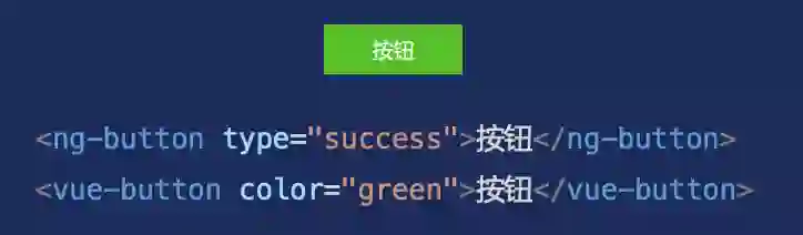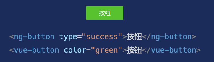 如果仅仅是生成不同技术栈的源码,相信很多低代码平台都能做到,但是我们面对的是不同技术栈的组件。比如一个按钮,CRM 是用 Angular 开发的,DevOps 是用 Vue 开发的。两个技术栈开发的按钮,它们的属性、方法、事件,甚至功能都不一定相同。打个比方,我们要给这个按钮设置颜色,Angular 的属性名称叫 type,属性的值是 success,而 Vue 的属性名称叫 color,属性的值是 green,两者并不匹配,如下图所示: