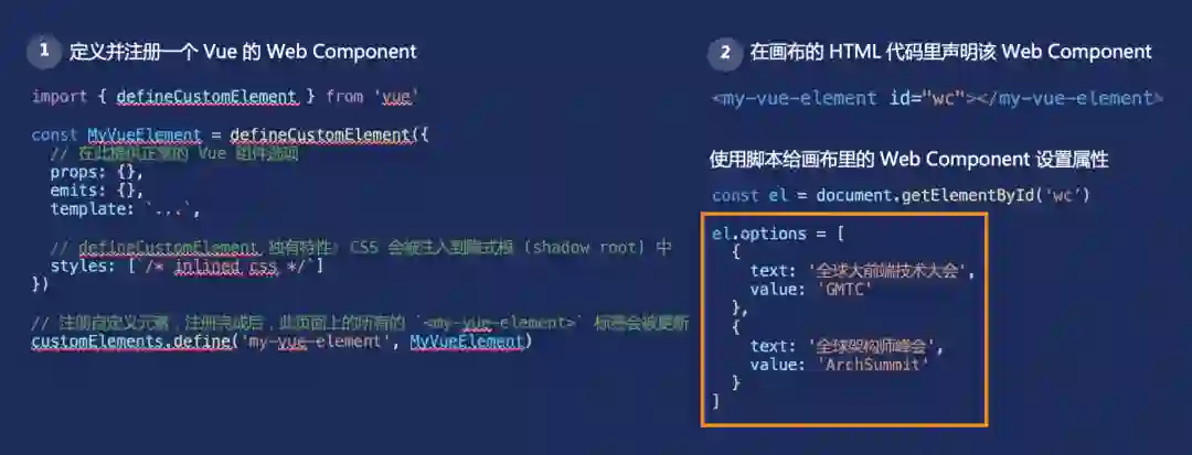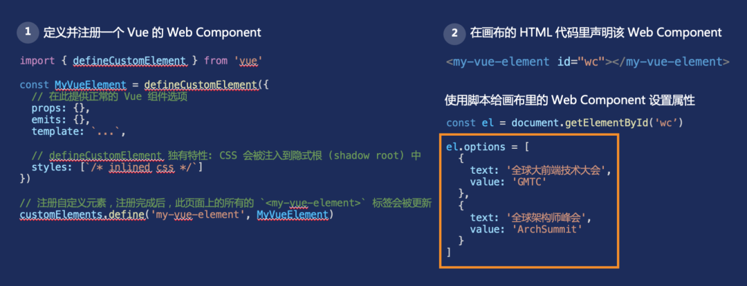 我们来举个 Vue 的例子说明 Web Component 方案。首先按照 Vue 官方的示例,定义一个 Vue 的组件,并注册成为 Web Component。然后在画布的 HTML 代码里,我们声明该 Web Component。假设这个 Vue 组件暴露的 options 属性,是数组类型。我们知道,在 HTML 标签上,attribute 属性只能设置为字符串或数值类型,因此,我们需要通过 JavaScript 脚本动态设置 options 的属性值。如下图所示: