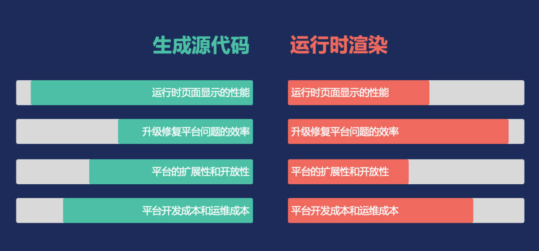 第二项,由于运行时渲染一般要求所有应用都用统一的解析引擎,因此升级和修复平台问题时,只需针对统一的解析引擎,其效率自然要高于每个应用的源码都需要重新编译的方式;