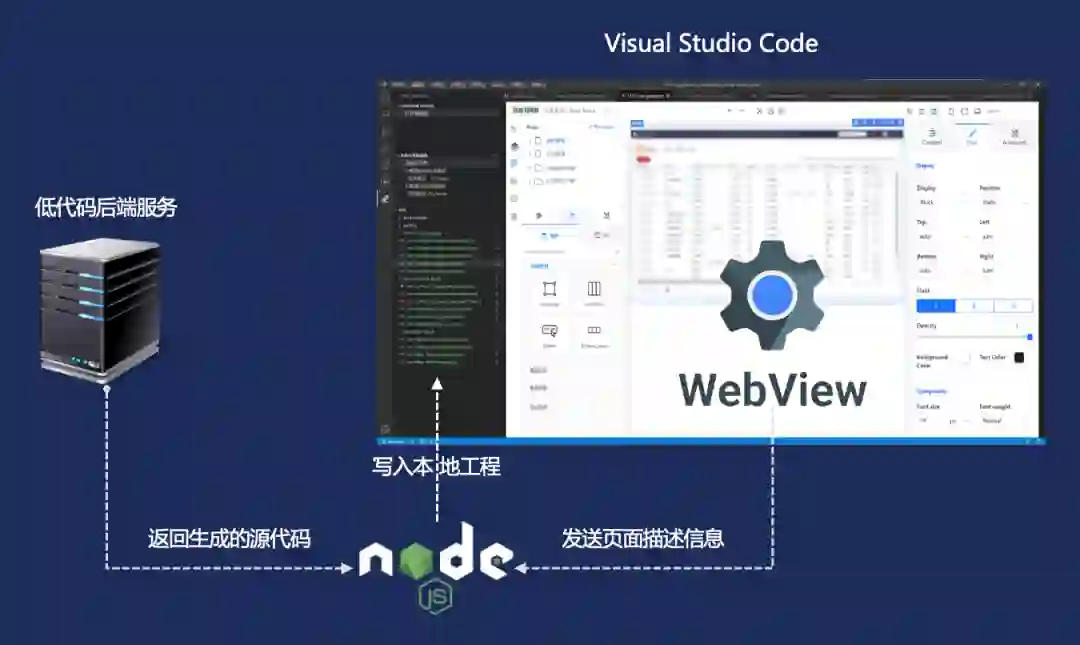 由于 VSCode 它本身自带 Node.js 客户端,于是我们就想到,把这个 Node.js 客户端当做代理服务器,转发 WebView 的请求。当后端服务返回生成的源代码后,再借助 Node.js 客户端将源代码写入到本地工程。这样,就实现了高低代码混合开发的基本功能。最后我们还需要在 VSCode 里,实现内置的账号登录功能,这样才能让请求带上 Cookie,完成整个平台的鉴权。