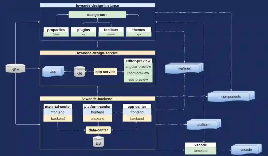 物料中心会构建出两个产物,分别是物料资产包,以及搭建页面所需的组件库,它们会被低代码平台实例动态加载。每个平台实例都是由设计器各个模块组装而成,这些设计器的模块都来源于 npm 仓库。每个平台的实例都会请求对应的平台服务,平台服务提供各技术栈的页面预览功能,并且将生成的代码提交到 Git 库,再通过流水线发布应用。