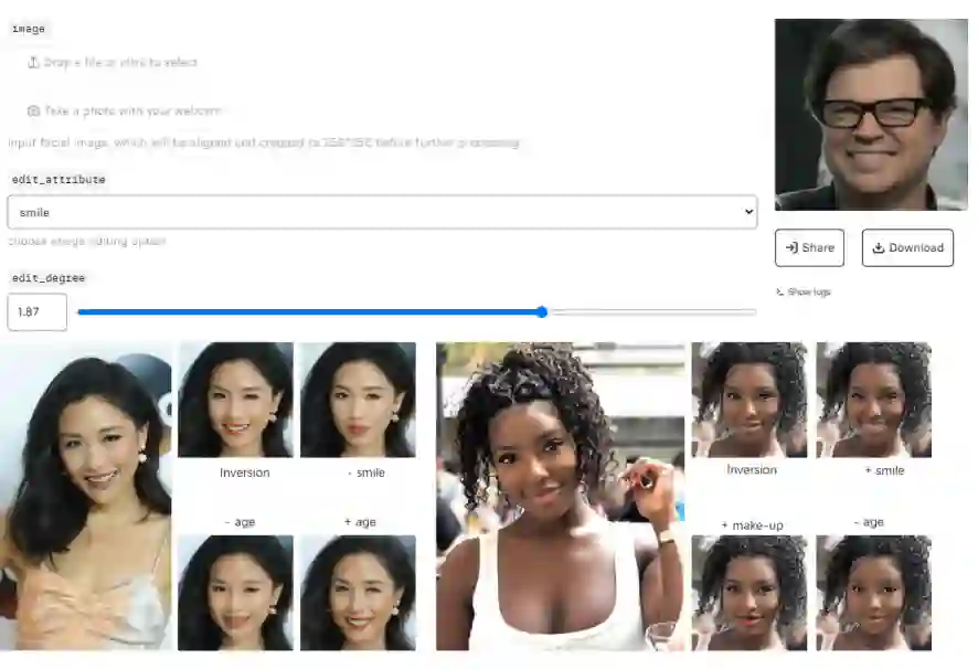 这么好玩的方法,想不想用自己或者朋友的照片来体验一下?作者提供了一个online demo,可以自己上传图片或者用摄像头拍照来进行编辑。