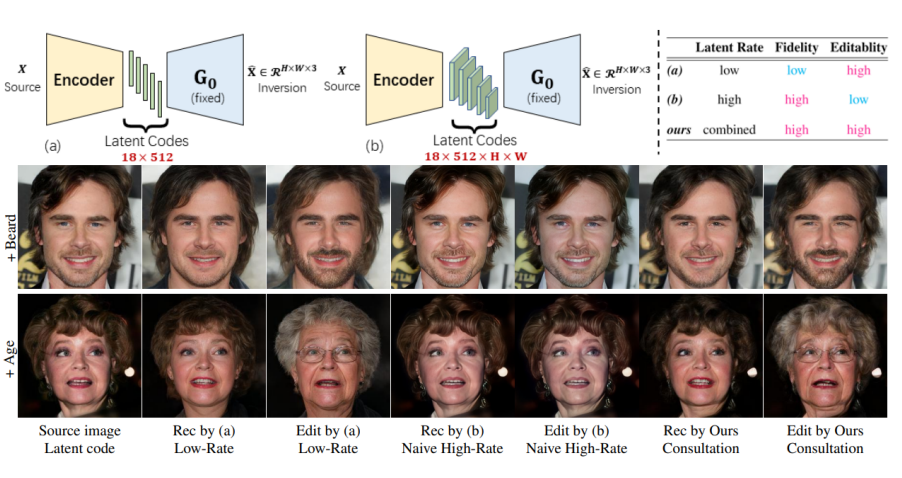 那么,是不是我们直接增大编码器输出隐编码的大小(high-rate),问题就解决了呢?答案是:yes and no。这样做确实可以提升重建图像的保真度,但是我们的目的是对图像进行编辑而不是重建。Low-rate隐编码由于是通过高度压缩的,所以可以编码一些高级、丰富、解耦的语义,这些隐编码在隐空间里通过操控(vector arithmetic)可以方便的编辑图像属性。但对于high-rate隐编码,冗余会造成隐编码耦合,而且编码通常缺乏语义信息(low-level),这就导致图像难以有效编辑。