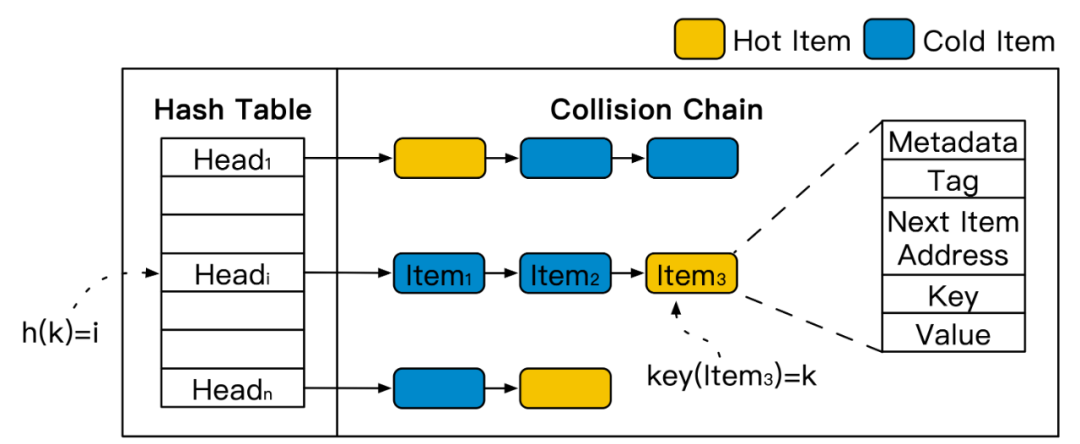 现有的内存KVS引擎通常采用链式哈希作为索引,结构如下图所示。首先,根据数据的键值(k)计算其哈希值h(k),对应到哈希表(Hash table)的某个头指针(Headi)。根据头指针遍历相应的冲突链(Collision Chain)的所有数据(Item),通过键值比较,找到目标数据。如果目标数据不在冲突链中(read miss),则可在冲突链头部插入该数据。