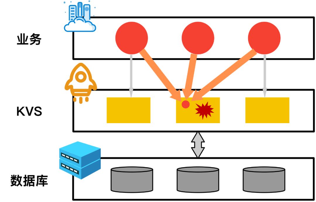直观上可以用下图来解释。以苹果新手机发售举例。手机的库存等信息只存在KVS的一个节点中。当新手机发售后,大量的果粉疯狂进行抢购下单,业务的访问量基本都聚集在这一个节点上。节点可能无法承载大量的热点访问,进而引发系统崩溃,严重影响用户体验。