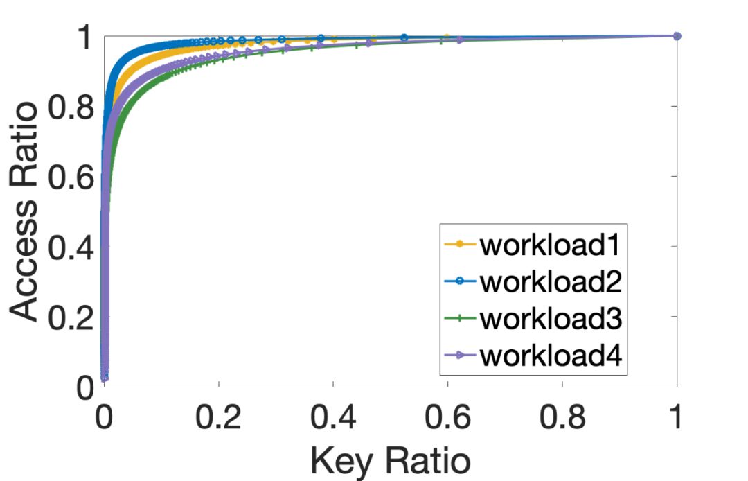 我们分析了多种业务的数据访问分布,如下图所示,大量的数据访问只集中在少部分的热点数据中,若用离散幂率分布(Zipfian)刻画,其θ参数约为1.22。相似地,Facebook的一篇论文同样也展示了近似的数据访问分布(参考论文[3])。