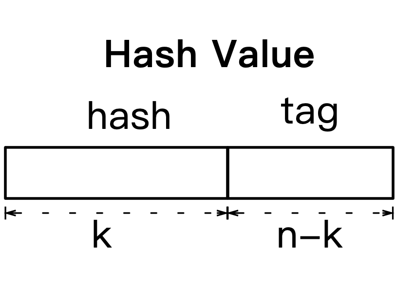 如下图所示,tag是哈希值的一部分,每个key计算的哈希值,前k位用来哈希表的定位,后n-k位作为冲突链中进一步区分key的标志。为了减小排序开销,我们构建字典序:order = (tag, key)。先根据tag进行排序,tag相同再根据key进行排序。