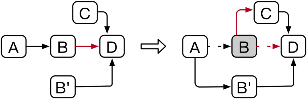 如下图所示,在链A->B->D上,线程1进行插入C的操作,同时线程2进行RCU更新B的操作,尝试更新为B'。线程1修改B的指针指向C,完成插入。而线程2修改A的指针指向B'完成更新。两个线程并发修改不同的内存,均可成功返回。但是这时遍历整条链(A->B'->D),将发现C无法被遍历到,导致正确性问题。