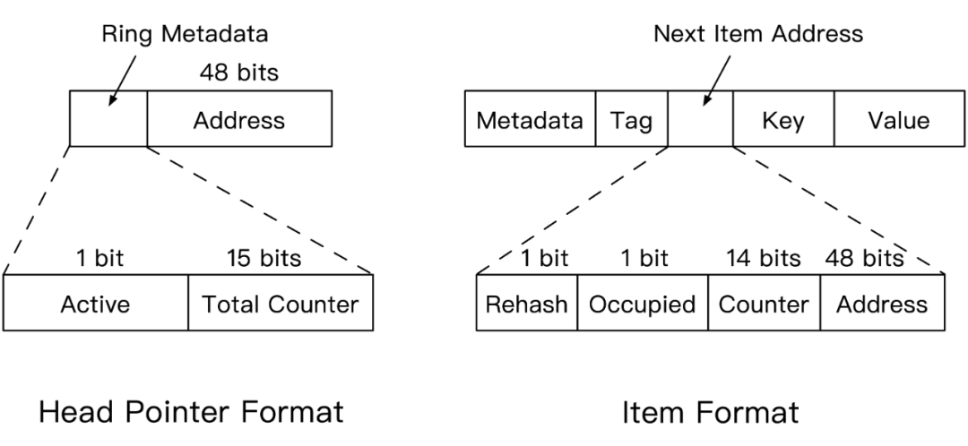 采样所需的元数据结构如下图所示,分别在头指针处设置Total Counter,记录该环的访问总次数,每个item设置Counter记录该item的访问次数。因为内存指针需要分配64bits,但实际系统地址索引只使用其中的48bits。我们使用剩余16bits设置标志位(例如Total Counter、Counter等),保证不会增加额外的元数据开销。该策略的优势是,通过采样分析,可以计算选出最优的头指针位置,稳态时性能表现更优。