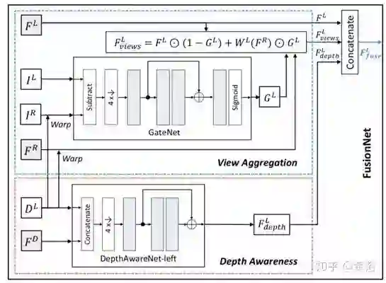 最后,连接原始左图特征FL,视角聚合特征FLviews和深度觉察特征FLdepth生成融合的左视角特征FLfuse。然后,将FLfuse供给DeblurNet的解码器。同理,采用FusionNet一样的架构可以得到右视角的融合特征。