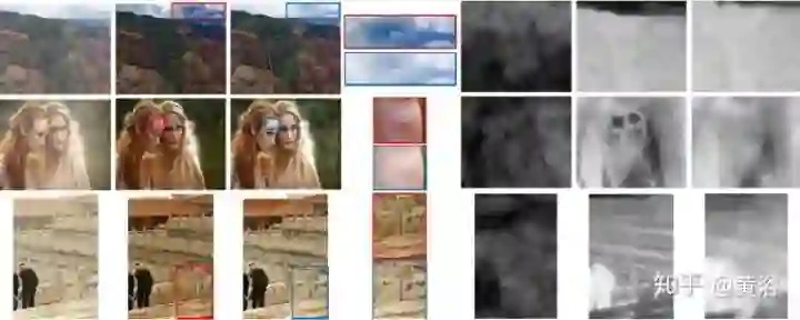 下图是一些实验结果的分析:白色和明亮场景中去雾结果的比较;第1栏:输入图像; 第2栏:通过固定尺寸补丁DCP的结果; 第3栏:PMS-Net方法的结果; 第4栏:第2栏和第3栏中白色或亮部的放大; 第5栏:补丁图; 第6-7栏:分别由DCP和PMS-Net方法估计的介质传输图。