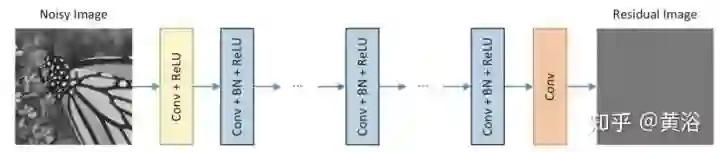 如图是DnCNN架构图。给定深度为D的DnCNN,有三种层。(i)Conv + ReLU:第一层,64个大小为3×3×c的滤波器生成64个特征图,然后是ReLU,这里c表示图像通道数,灰度图像c = 1,彩色图像c = 3。(ii)Conv + BN + ReLU:层2~(D-1),64个大小为3×3×64的滤波器,在卷积和ReLU之间添加BN。(iii)Conv:最后一层,c个尺寸3×3×64滤波器来重建输出。