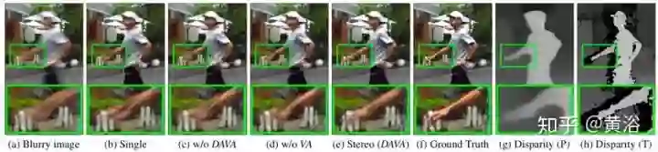 如图显示的是视差对去模糊的作用:(a)(f)(g)和(h)分别表示模糊图像、清晰图像、预测的视差和GT视差。(b)和(e)是单目去模糊网络DeblurNet和双目去模糊网络DAVANet的结果。在(c),两个左图像输入,DispBiNet不能为深度觉察和视角聚合提供任何深度信息或视差。在(d)中,为了消除视角聚合的影响,不会从FusionNet中其他视图变形该特征。由于该网络可以准确估计和采用视差,因此其性能优于其他方法