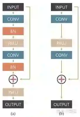 这是一种多尺度卷积神经网络,以端到端的方式恢复清晰的图像,其中模糊是由各种来源引起的,包括镜头运动、景物深度和物体运动。如图是定义的网络模型架构图,称为ResBlocks:(a)原始残余网络构建块,(b)该网络修正的模块化构建块;没有使用批量归一化(BN)层,因为训练模型使用的小批量(mini-batch)大小为2,比BN通常要小;在输出之前去除整流线性单元(ReLU)有利于提高经验性能。