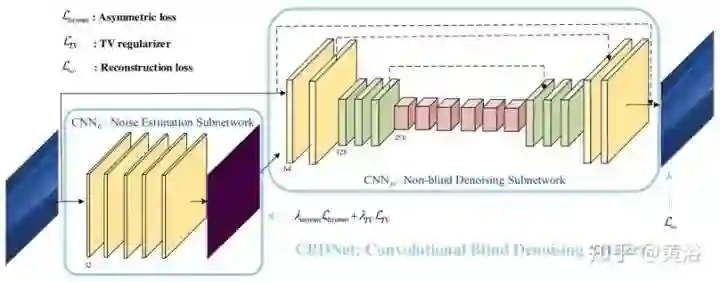 为了提高深度去噪模型的鲁棒性和实用性,卷积盲去噪网络(CBD-Net,convolutional blind denoising network)结合了网络结构、噪声建模和非对称学习几个特点。CBD-Net由噪声估计子网和去噪子网组成,使用更逼真的噪声模型进行训练,考虑到信号相关噪声和摄像头内处理流水线。非盲去噪器(例如著名的BM3D)对噪声估计误差的不对称灵敏度,可以使噪声估计子网抑制低估的噪声水平。为了使学习的模型适用于真实图像,基于真实噪声模型的合成图像和几乎无噪声的真实噪声图像合并后训练CBDNet。