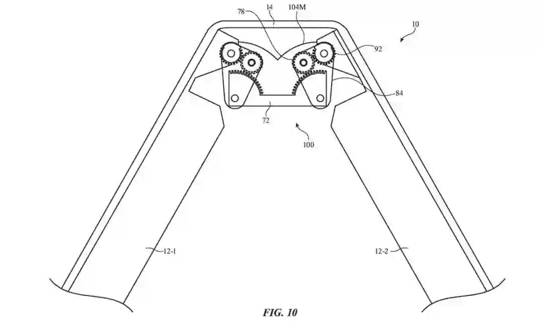2021 年 3 月公布的这项专利显示,苹果设计了一个“带齿轮铰链的折叠屏设备”,通过齿形杆件和齿条,增强折叠屏设备的灵活性,同时防止屏幕因为过度弯曲、移动过快出现意外损坏,有些微软 Surface Duo 的意思。