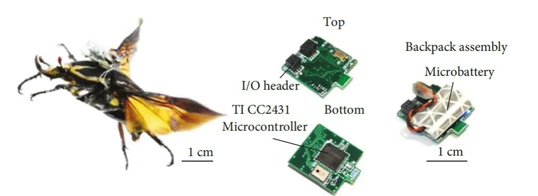 “电子背包”由一个小型的微控制器、九轴 IMU、接收和发送器组成,微型 I/O 接头可以连接电极,整个设备由微型锂电池供电,IMU用于测量方向和运动。这个背包重1.6g左右,几乎不会影响甲壳虫的飞行速度。