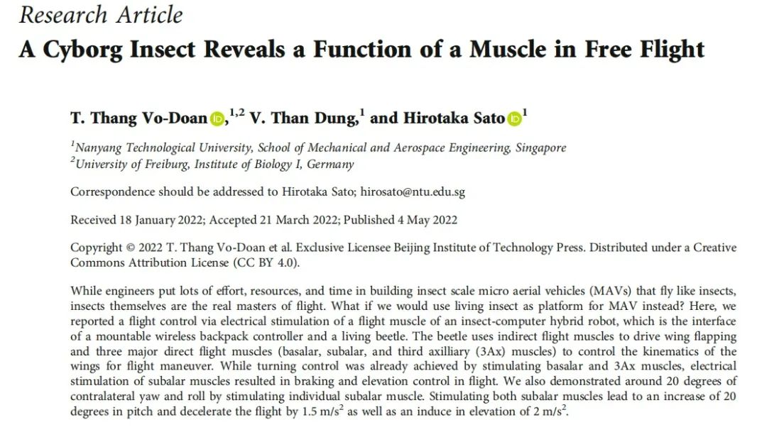 这项研究的标题为《A Cyborg Insect Reveals a Function of a Muscle in Free Flight》,发表在由北京理工大学主办的Cyborg and Bionic Systems(类生命系统)期刊中。