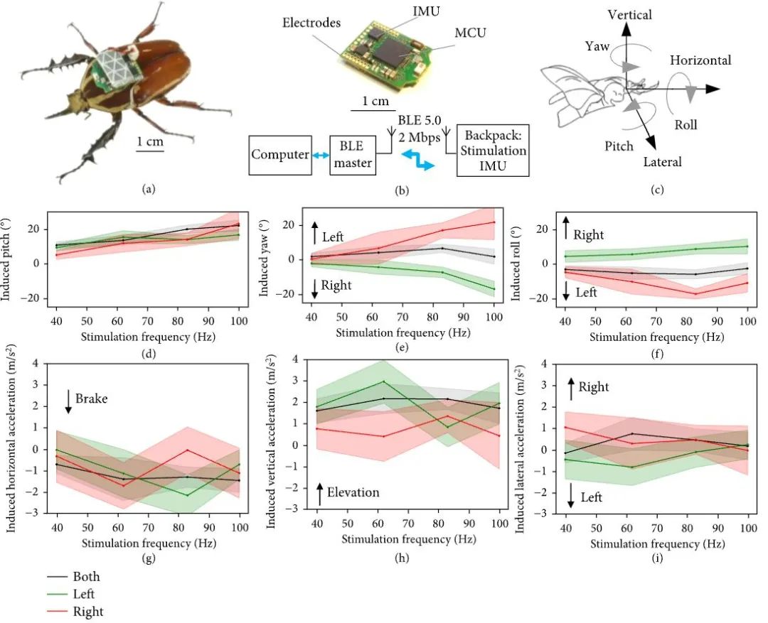 实验结果证明:刺激单边的「翼下肌肉」会让机器甲壳虫该测的俯仰角从 5 度增加到 22 度,侧偏航角从 2 度逐渐增加到 17 度;同时其水平加速度降低,垂直加速度增加,这表明机翼的阻力和升力的增加。