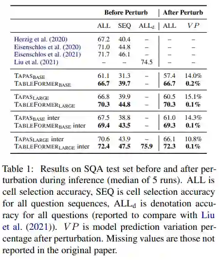 除了标准的评测数据,本文还将SQA和TabFact的测试集中的表格行列施加随机扰动,构造了扰动测评的场景。