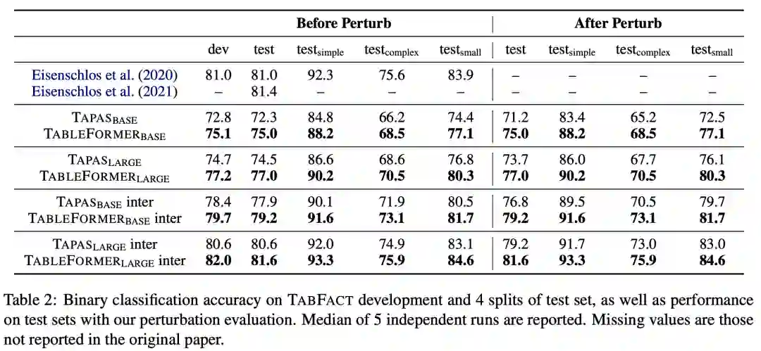 在TabFact上同样取得了比TAPAS显著的提升,在扰动测试的场景下提升更为明显: