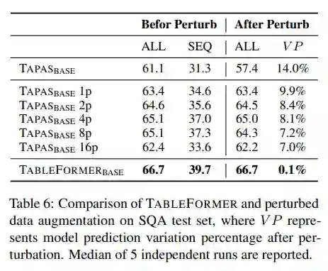 本文也对TableFormer和这种数据扩增进行了对比实验。实验表明,数据扩增虽然可以减小扰动对于模型总体效果的影响,但最好的表现依然逊色于TableFormer,可能由于TableFormer带来了额外的有效偏置信息(如文本表格对齐等)。