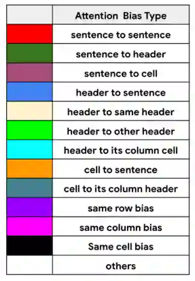举例来说,表格中某个token对同一行或者同一列的token会有特定的注意力分数,对文本token会有特定的注意力分数,对表头相应的列名称也会有特定的注意力分数。