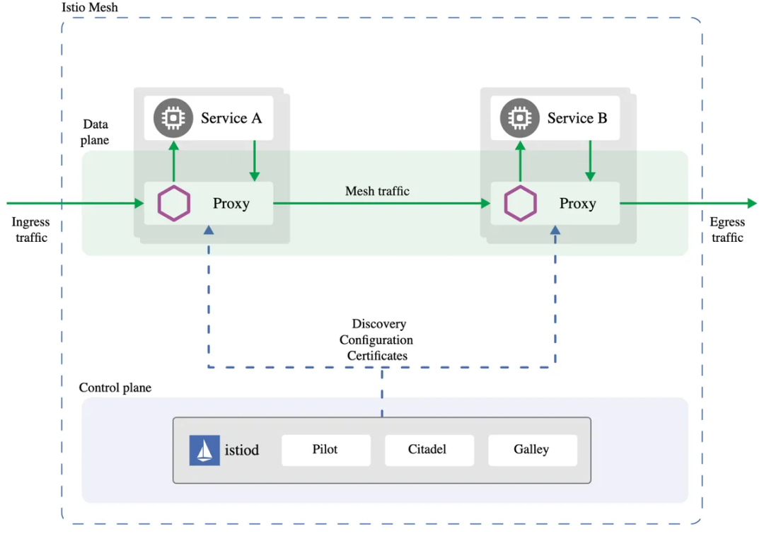下面的图表摘自 Istio 体系结构文档,尽管提到的技术是特定于 Istio 的,但组件对于所有服务网格实现都是通用的。