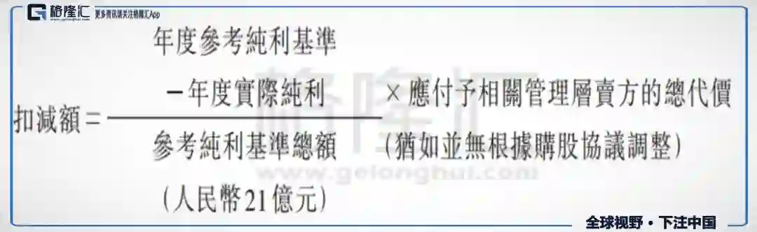 若管理层当年度没有完成相关业绩承诺,则当期原先应拿到的分期金额减去上述公式厘定的扣减额,然后再给予管理层。