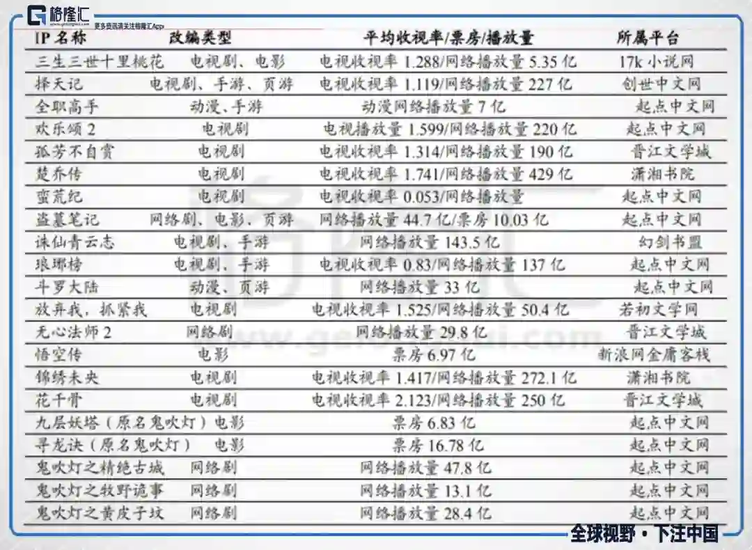 后来随着网络玄幻修仙题材剧的走红,比如《花千骨》的火爆,引起了业内对该类题材的关注,随后阅文集团开始尝试IP版权资源输出给影视剧制作公司,目前已经成功输出《鬼吹灯》、《盗墓笔记》、《琅琊榜》、《择天记》等大量优秀改编作品。