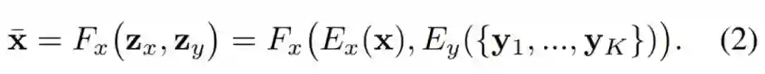 如果想要了解 FUNIT 的学习过程,那么了解它的目标函数及组成模块是最好不过了。如前所述,整个 FUNIT 框架主要包含 Few-shot 图像转换器和多任务对抗判别器。其中 Few-shot 图像转换器 G 又包含内容编码器 E_x、类别编码器 E_y 和解码器 F_x,通过这些模块,前面方程 (1) 就可以改写为: