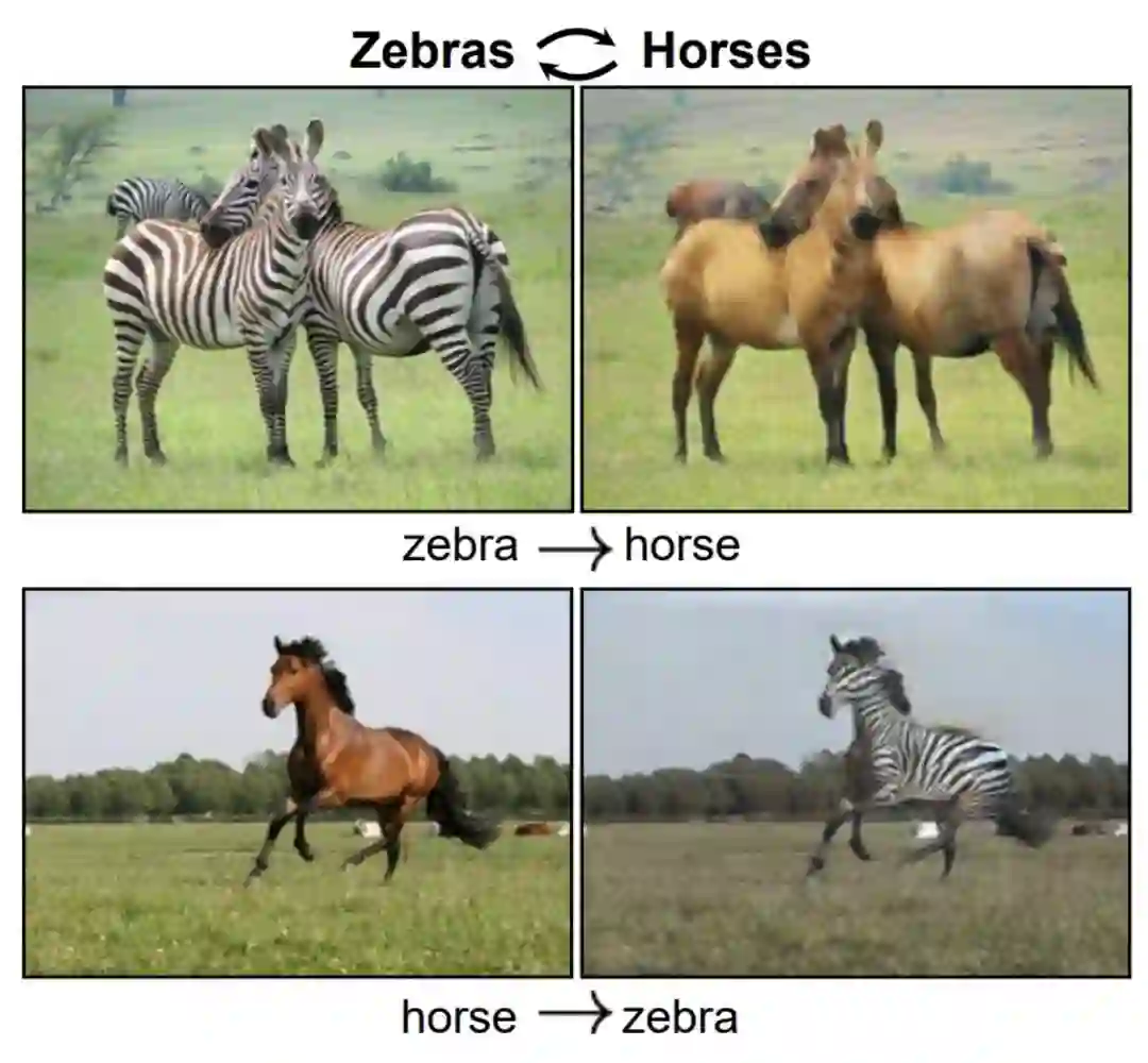 上面英伟达的 FUNIT 已经非常强了,那么一般的图像转换又有什么问题呢?说到图像到图像的转换(image-to-image translation),我们最熟悉的可能就是 CycleGAN,它可以将某种图像转换为另一种,例如将马转换为斑马。