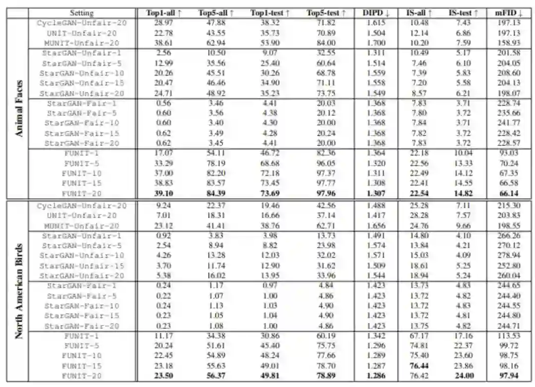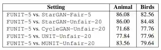 结果表明,无论是与「公平」还是「不公平」的基线相比,受试者都认为 FUNIT-5 生成的结果更加可信。