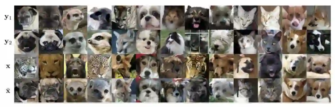 如上所示,其中 y_1 和 y_2 是测试阶段可用的目标类 few-shot 样本图像、x 是源类输入图像,而 x bar 就是源类到目标类的转换结果了。我们可以看出来,x 和 x bar 之间的「神态」都非常相似。