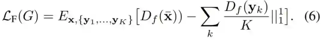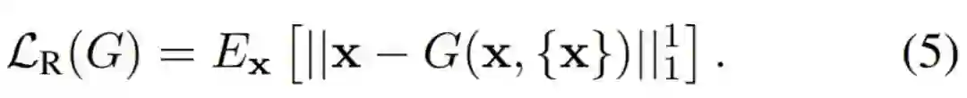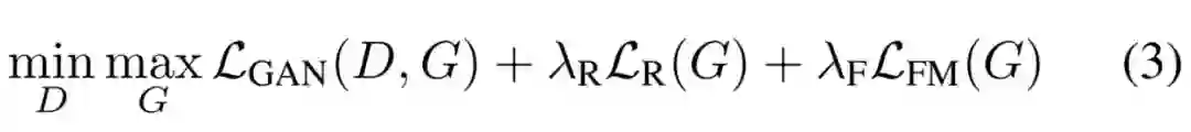 其中 L_GAN、L_R 和 L_F 分别是 GAN 的损失函数、图像内容重构损失和特征匹配损失,它们共同构建了整个模型的目标函数。下面简要地展示了这三种损失函数的计算公式,当然在原论文中,这三个损失函数都有详细的解释,读者可参考原论文理解。