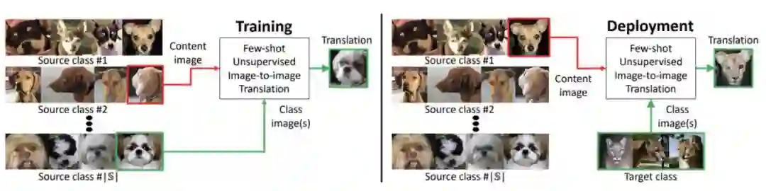 虽然当前无监督图像到图像转换算法在很多方面都非常成功,尤其是跨图像类别的复杂外观转换,但根据先验知识从新一类少量样本中进行泛化的能力依然无法做到。具体来说,如果模型需要在某些类别上执行图像转换,那么这些算法需要所有类别的大量图像作为训练集。也就是说,它们不支持 few-shot 泛化。