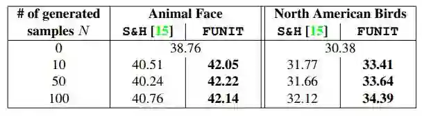 他们发现,与 Hariharan 等人提出的 few-shot 分类方法相比,利用 FUNIT 所生成图像训练得到的分类器性能更好。