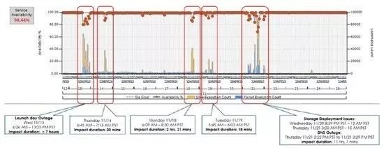 但在服务发表之后,Visual Studio Online 却发⽣了异常,造成七个小时服务中断,这是因为在服务上线时,我们没有预想到它会⾯临如此大的流量冲击,所以仅使⽤⼀个扩展单元(Scale Unit)来运行我们的服务,但在欧洲和美国的服务上线时,我们的系统遭遇了流量的顶峰,必须要同时提供服务给上百万的使⽤者,系统不足以乘载这么大量的使用者导致服务中断。