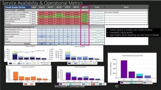图三,相较于 6 个⽉之前 (2013 年 11 月 ) 发⽣了 43 次 LSIs,Visual Studio Online 在 2014 年 4 ⽉只发⽣了 7 次 LSIs ,只有 2 个是发⽣在公开的功能中。