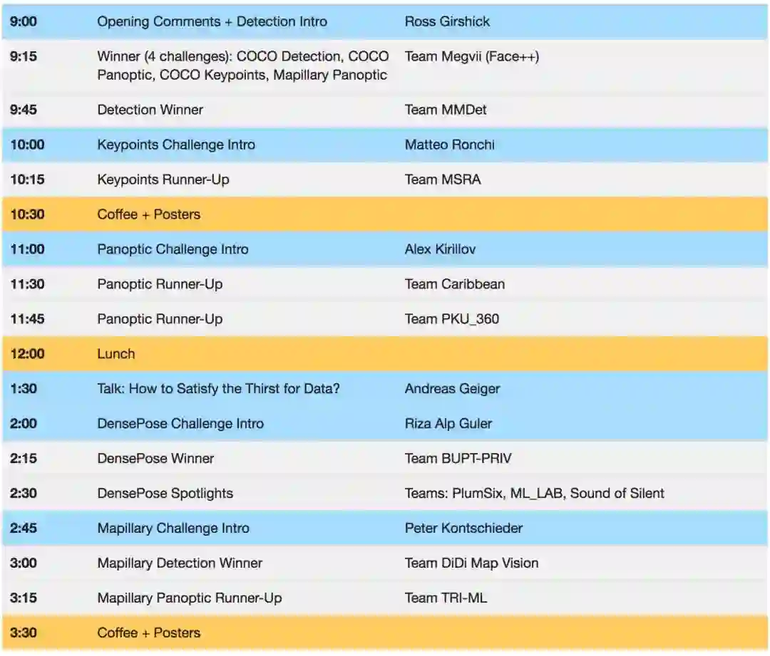 虽然其他 COCO 赛项得分还未显示在 Leaderboard 上,但我们可以从 COCO + Mapillary 联合挑战赛官网公布的 Workshop 日程上看出: