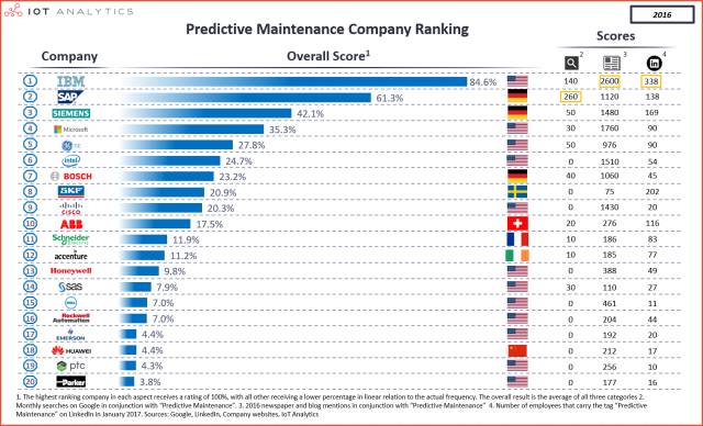 除了GE、西门子等传统工业企业以外,技术巨头亚马逊、思科、Google、IBM以及微软等也对工业物联网虎视眈眈,甚至一些初创企业也蠢蠢欲动。值得注意的是,下一代分析技术的许多技术创新来自于一些初创企业。报告指出,由于各种原因(例如成本,数据隐私和灵活性),许多原始设备制造商更愿意与较小的供应商进行合作。在有关预测性维护项目的大军中,C3 IoT、Uptake和SpaceTimeInsight这三家无疑最受欢迎,资金输入自然名列前茅。