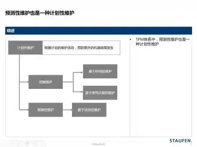 预测性维护(Predictive Maintenance,简称PdM)是以状态为依据(Condition Based)的维修,在机器运行时,对它的主要(或需要)部位进行定期(或连续)的状态监测和故障诊断,判定装备所处的状态,预测装备状态未来的发展趋势,依据装备的状态发展趋势和可能的故障模式,预先制定预测性维护计划,确定机器应该修理的时间、内容、方式和必需的技术和物资支持。预测性维护集装备状态监测、故障诊断、故障(状态)预测、维修决策支持和维修活动于一体,是一种新兴的维修方式。