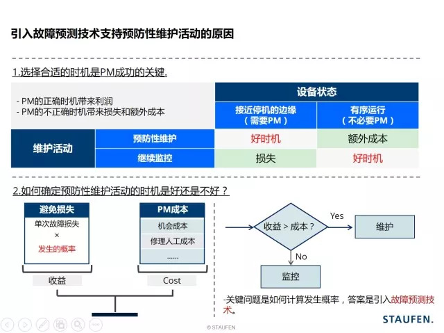 在现实的生产过程,故障的发生率远比我们想像的更加难以控制:产生线突然的停机,排除故障的延时,人为的操作失误,重复的设备维护导致额外成本的增加,维护设备的不及时性等。我们往往都在被动的接受故障发生,并在故障发生后进行着“不能精确计算是否为最合理”的维护。