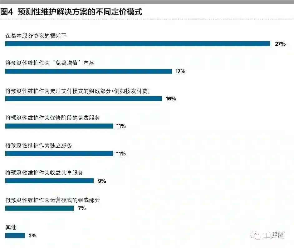 仍未明确预测性维护的盈利模式:有90%的受访对象提到了如何通过提供预测性维护服务盈利的问题,这显然是企业尝试建立商业模式时候面临的普遍困扰。原因之一是长久以来,制造业的客户不愿为数字化服务买单。受访企业现在更多考虑基于成本的定价模式,而非基于业绩表现“更数字化”的模式。(图4)