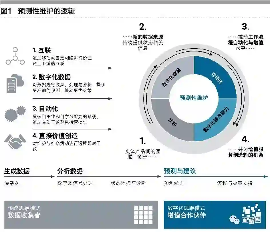 拥有精确预测的能力后,产品生产和服务的整个过程以及相关决策都能变得更为主动、有针对性,并且有数据支撑。预测性维护使得供应商能够成为客户更好的增值伙伴。(图1)