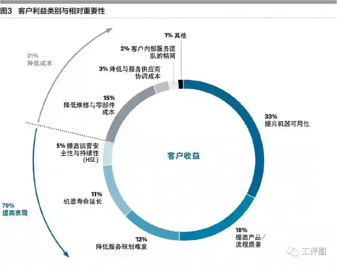 受访对象认为,预测性维护对客户带来的主要价值在于业绩提升:79%的受访对象表示,得益于更好的机器可用性、更长的服务寿命以及更稳定的工作等,客户从预测性维护中获得的主要益处是生产方面的优异表现。相较而言,仅有不到五分之一的受访公司将预测性维护看作削减维护成本的手段。(图3)