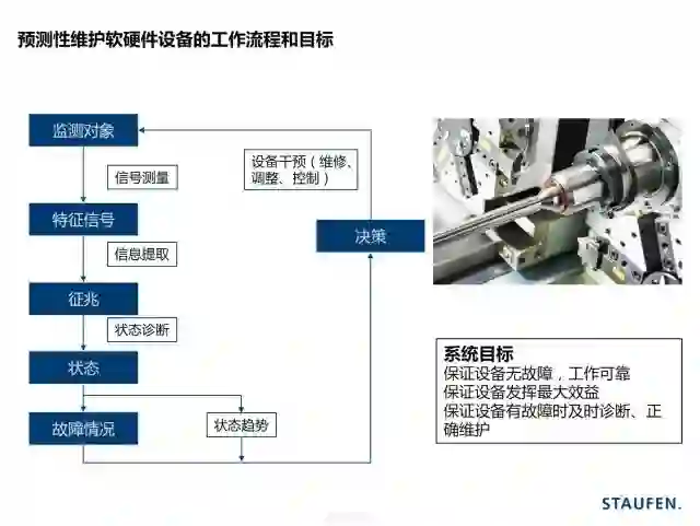 广义的预测性维护将状态监测、故障诊断、状态预测和维修决策多位合一体,状态监测和故障诊断是基础,状态预测是重点,维修决策得出最终的维修活动要求。广义的预测性维护是一个系统的过程,它将维修管理纳入了预测性维护的范畴,通盘考虑整个维修过程,直至得出与维修活动相关的内容。