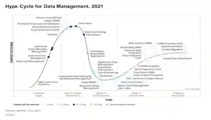 在 2018 年的 Gartner 数据管理软件技术成熟度曲线中,DataOps 第一次出现在“Innovation Trigger”初始阶段。在 2021 年的曲线中,DataOps 已经快速发展到“Peak of Inflated Expectation”边缘了。同时,硅谷已经出现了一批以 DataOps 理念为核心打造数据产品的创业公司并得到了风险投资的大力支持,比如以集成开发为核心的 FiveTran 和 AirBytes,以 SQL 开发管理为核心的 DBT, 以调度为核心的 Astronomer 等等。