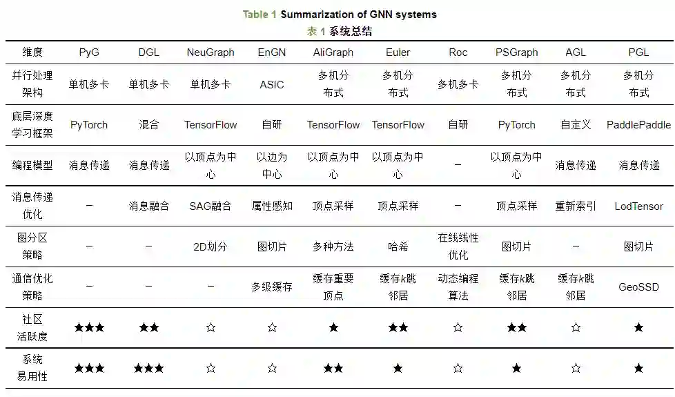为了应对这些挑战, 出现了很多针对图神经网络的训练框架, 其中单机系统如PyTorch Geomertic、DGL、NeuGraph. 图神经网络通常处理非常大且不规则的图, 这些大图无法存储在单个设备中, 因此必须以分布式方式进行分区和处理, 其中分布式图神经网络框架如Euler、AliGraph、Roc、AGL. 接下来本文将介绍若干典型的单机图神经网络系统以及分布式图神经网络系统.