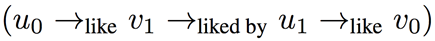 一个简单的基于路径的结构特征如下,假如我们想知道用户u0对于商品v0的评分,我们可以看有多少和u0品味相似的用户u1对v0打了高分;而品味相似可以用是否这个u1和u0曾经都给某个其它的商品v1打过高分。总结下来,这样的一个路径特征即为: